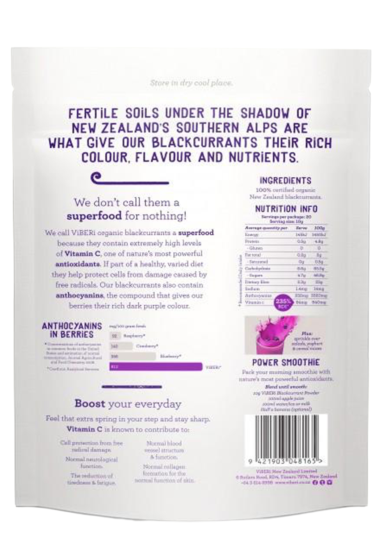 Our ViBERi Blackcurrant Powder is 100% Organic and contains only the pure goodness of New Zealand Blackcurrants.